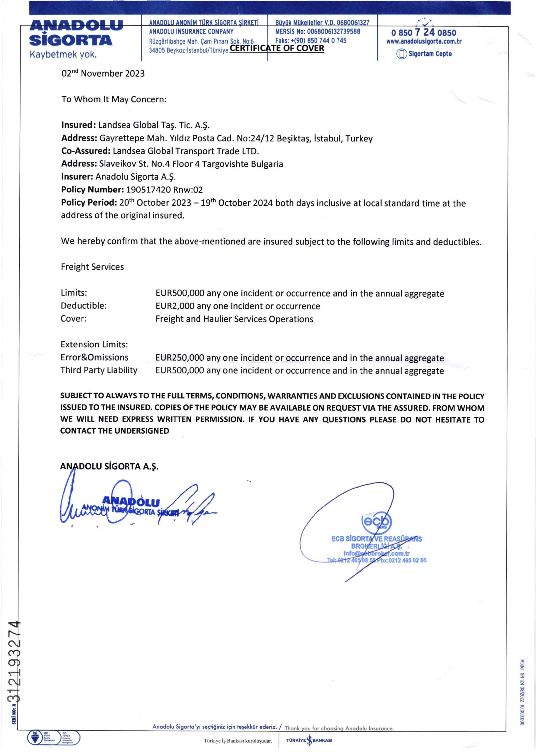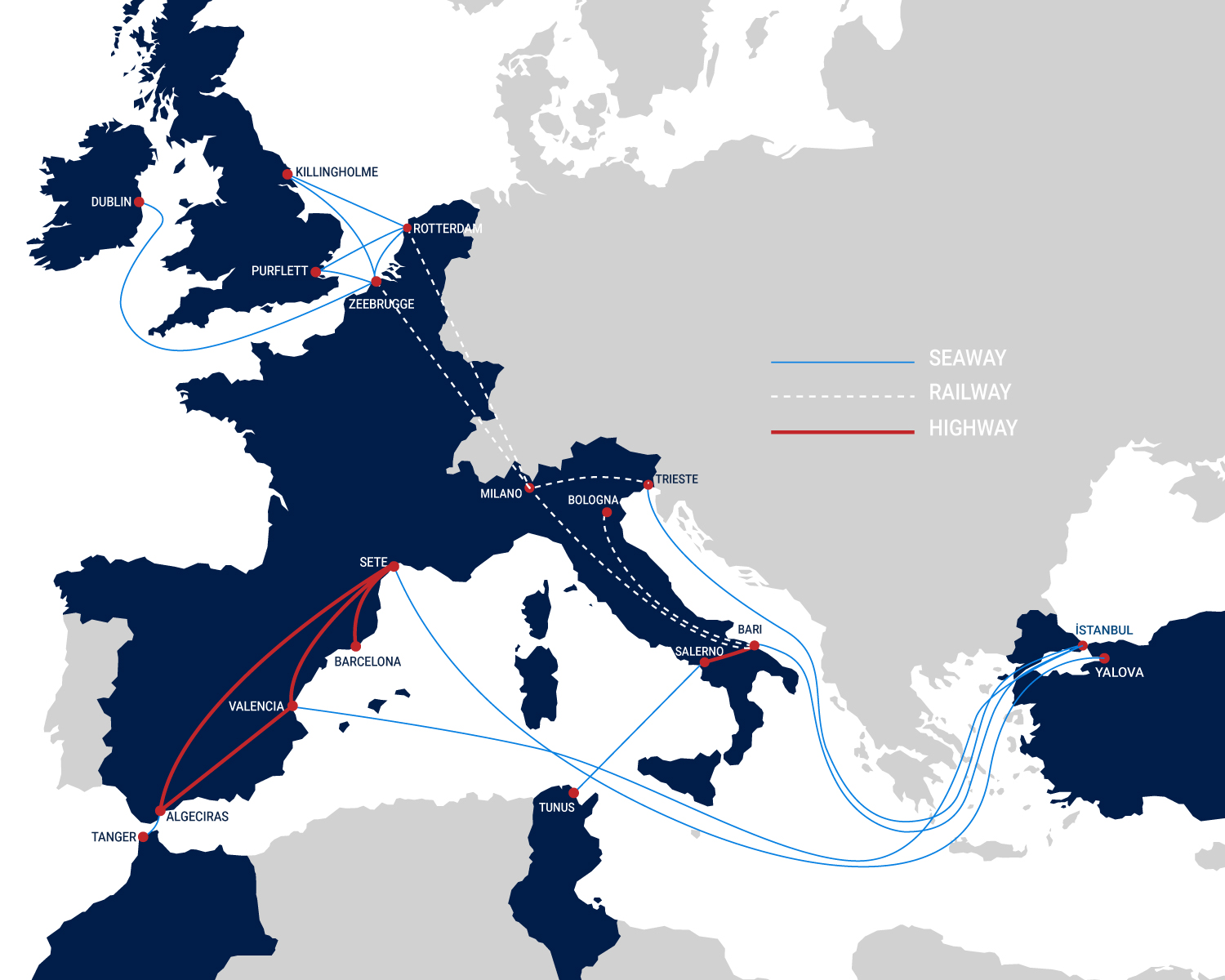 LandSea Global’in uzun vadeli iş ilişkileri ve kesintisiz iletişim anlayışı, müşteri memnuniyetindeki başarının temelini oluşturuyor. Avrupa ve Kuzey Afrika’daki geniş hizmet ağımız ve 45’PW öz mal ekipmanları aracılığıyla, intermodal taşımacılık hizmetleri sunuyor ve müşterilerin karmaşık lojistik ihtiyaçlarına yenilikçi, düşük maliyetli ve çevreci çözümler geliştiriyoruz.
